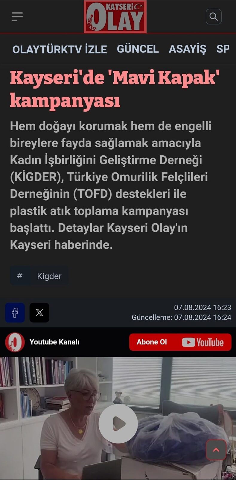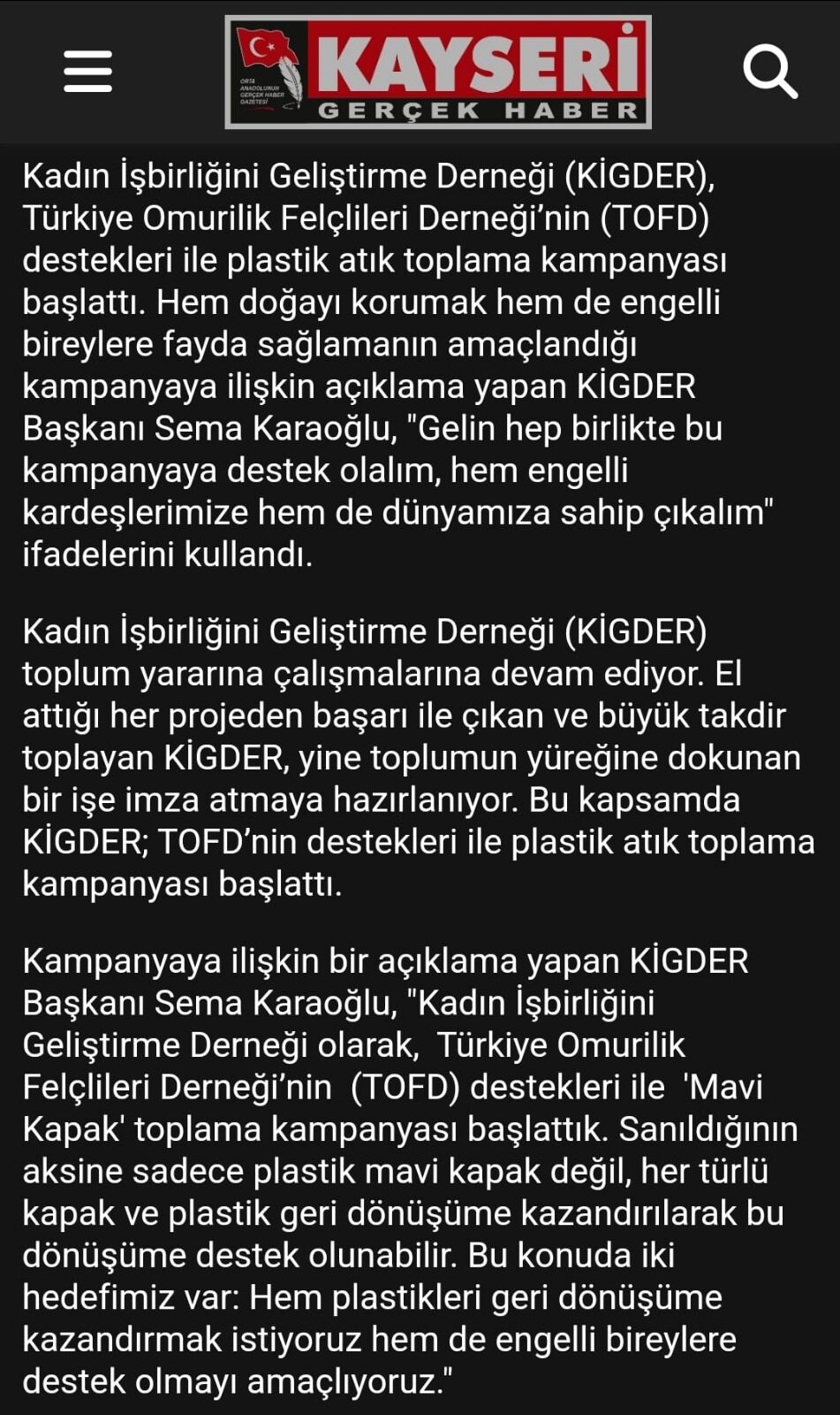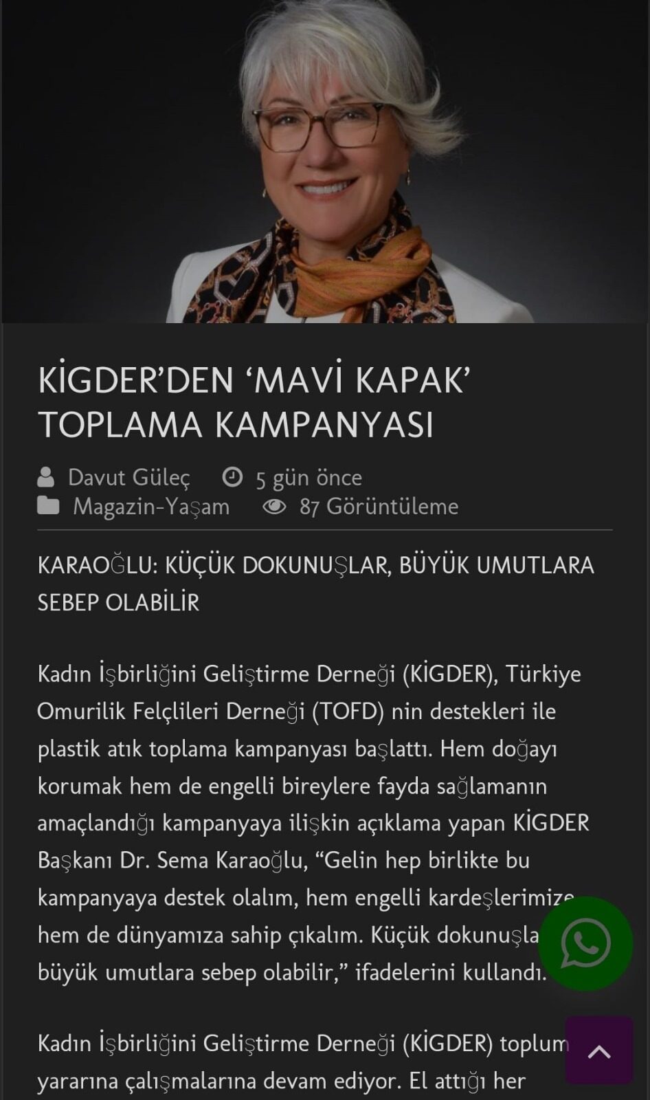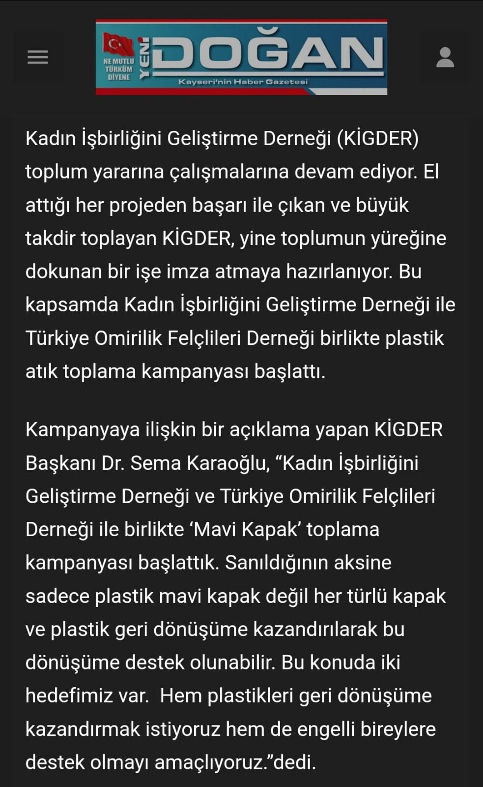 Kadın İşbirliğini Geliştirme Derneği (KİGDER) olarak, Türkiye Omurilik Felçlileri Derneği ile önemli bir sosyal sorumluluk projesine imza attık. İmzalanan protokol kapsamında, mavi kapak toplama kampanyası başlatılmıştır. Bu kampanyanın temel amacı, engelli bireyleri tekerlekli sandalye ile buluşturarak hayatlarına destek olmaktır.